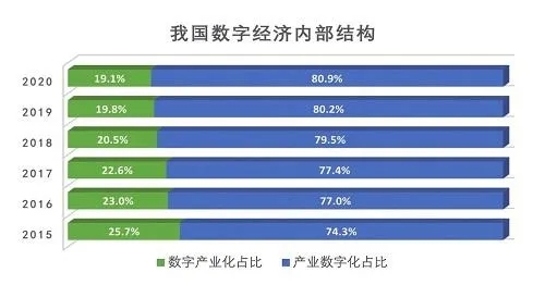 在全球经济增长乏力甚至衰退的背景下,数字经济持续保持高速增长,《白皮书》显示,2020年增速达9.7%,远高于同期GDP名义增速约6.7个百分点,是同期GDP名义增速的3倍多,成为稳定经济增长的关键动力。具体来看,产业数字化对数字经济的主导地位进一步巩固,2020年我国数字产业化规模达7.5万亿元,占数字经济比重为19.1%,占GDP比重为7.3%;产业数字化规模达31.7万亿元,占数字经济比重达80.9%,占GDP比重为31.2%,为数字经济持续健康发展提供强劲动力。