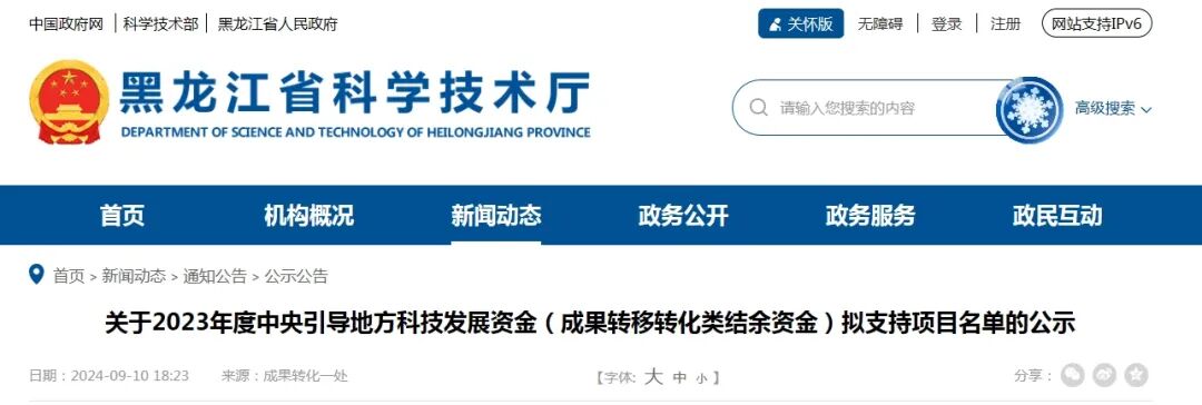 根据《中央引导地方科技发展资金管理办法》(财教〔2023〕276号)、《黑龙江省中央引导地方科技发展资金管理实施细则》(黑财规〔2024〕2号)有关规定,按照《关于组织申报2023年度中央引导地方科技发展资金(成果转移转化类结余资金)项目的通知》要求,经市(地)推荐、形式审查、专家评审、会议审定等程序,现将黑龙江省2023年度中央引导地方科技发展资金(成果转移转化类结余资金)拟支持项目名单予以公示(详见附件)。