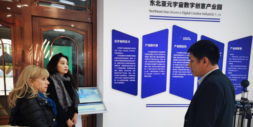随后,代表团移步至东北亚元宇宙数字创意产业园。这里充满科技感和未来感的元宇宙场景体验,涵盖了虚拟艺术展览、数字娱乐互动等多个领域,生动呈现了元宇宙技术在文化创意产业的多元应用与无限潜力。叶莲娜・伊万诺夫娜女士沉浸式体验了部分元宇宙项目,对这种新兴的数字创意形式表现出浓厚的兴趣,并对产业园在推动文化与科技融合方面所做出的努力给予了高度评价。